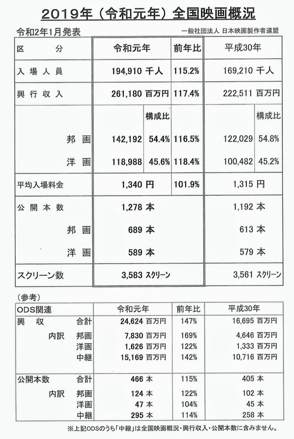 ちなみに日本映画製作者連盟では、映画館で最初に公開される作品を「映画」と規定している。近年はネット配信作品や、音楽コンサート、演劇、やスポーツ中継、オリジナルビデオアニメ、映画館以外のために作られた作品をスクリーン公開する「ODS」(Other Digital Stuff=映画以外のコンテンツ)が急速に増えており、ライブ中継以外のコンテンツの興行収入も2012年から集計に算入している。2019年度は246億2400万円(前年比147%)である。ただしODSはあくまでも「映画」ではないという立場だ。