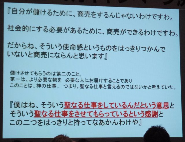 さらに、商売の意義を「聖なる仕事」としたという。「必要なものを必要な人に届ける、これは神の仕事である」。そして「商売は人のため、人に喜んでもらうため」。こうした聖なる仕事である商売に携わる時、1.商売の意義がわかる人 2.相手の心が読める人 3.人よりよけいに頭が下がる人が「一商人」であり、幸之助氏は全社員に「(松下電器が将来如何に大をなすとも)常に一商人なりとの観念を忘れず」と説いた。