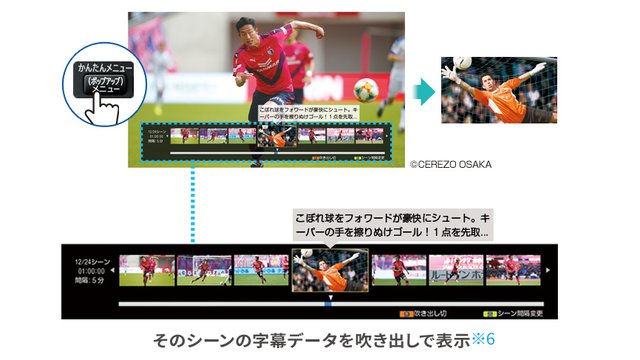 再生時の機能では、早送りしなくても中身がわかる「見どころポップアップ」を搭載し、録画番組を約5分毎に子画面表示できる。こちらの機能もリモコンに専用ボタンが用意されており、見たいシーンからすぐに再生することが可能。なお内蔵HDDに保存した番組が対象となる。