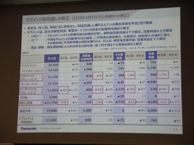 2019年10月31日公表値からの年間業績見通しは全社では据置とし、セグメント別では「足元の経営概況、事業ポートフォリオ改革の影響を反映して一部修正」とする。コネクティッドソリューションズが調整後営業利益を30億円下方修正、その他損益を200億円上方修正、営業利益を170億円上方修正。インダストリアルソリューションズは売上高を300億円下方修正、調整後営業利益を200億円下方修正、その他損益を180億円下方修正、営業利益を380億円下方修正した。「中国市況などマクロ環境は予断を許さない状況、これらを注視しながら経営体質強化に引き続き取り組む」とした。