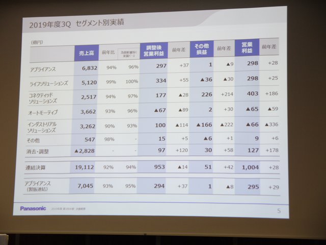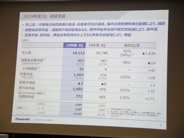 パナソニックは2019年度第三四半期決算概要を発表、同社取締役 常務執行役員CFOの梅田博和氏が説明を行った。