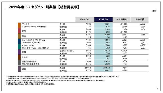 2019年度第3四半期の連結売上高は、前年同期から3%増の2兆4,632億円、営業利益は同769億円減の3,001億円、四半期純利益は同1,994億円減の2,295億円。また、EMI連結子会社化に伴う再評価益(音楽分野+1,169億円)など一時的な要因を除外した調整後の数字は、営業利益が前年同期比165億円増の2,765億円、四半期純利益が同583億円増の2,162億円となる。