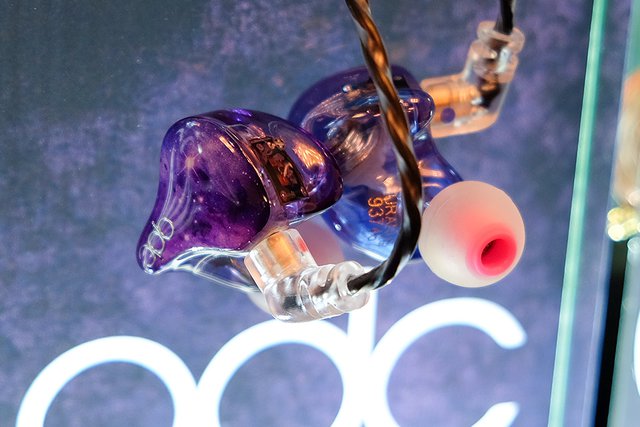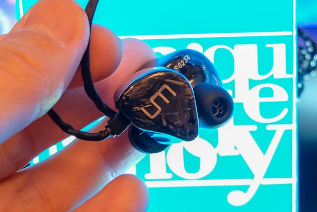 Unique Melodyの静電+骨伝導ドライバー搭載イヤホン「EST」は、前回イベントではクリアシェルだったが、今回はカーボンシェルでお披露目された。