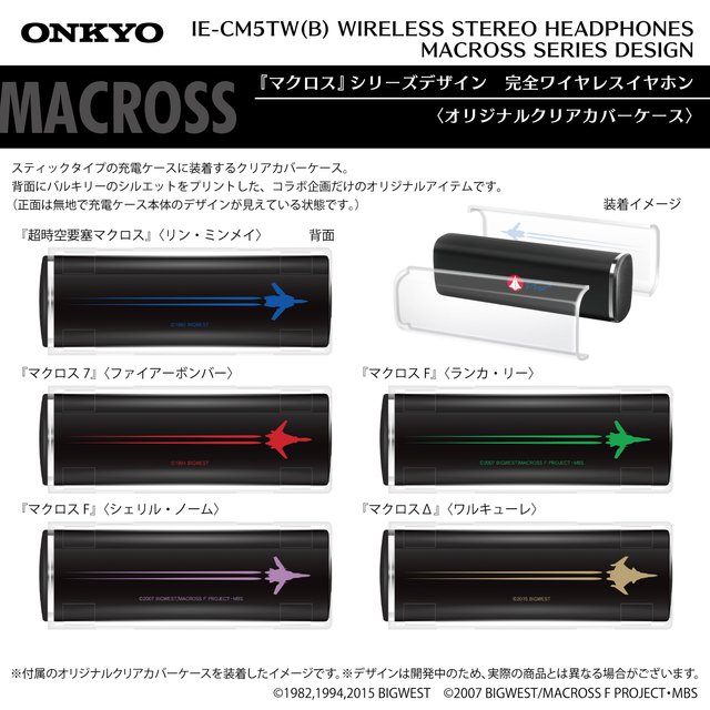 本体の充電ケースにもそれぞれの作品をモチーフにしたデザインをプリント加工するほか、付属のオリジナルクリアカバーケースの背面には『マクロス』シリーズ各作品に登場する「バルキリー」をプリントする。