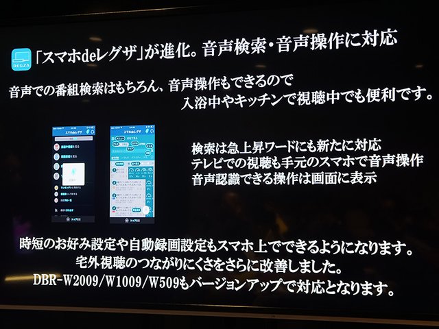 さらに、リモート視聴でのつながりにくさもさらに改善したとのこと。なお、スマホでの音声検索/音声操作には3月頃のアップデートで対応する予定で、2019年春モデル「DBR-W2009」「DBR-W1009」「DBR-W509」も同様にアップデート対応する。