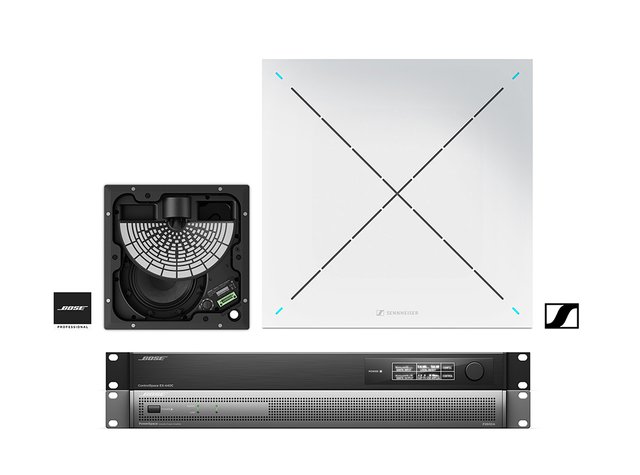Bose ES1 Ceiling Audio Solutionはゼンハイザー社の天井埋込マイク「TeamConnect Ceiling 2」とボーズの天井埋め込み型スピーカー「EdgeMax」、