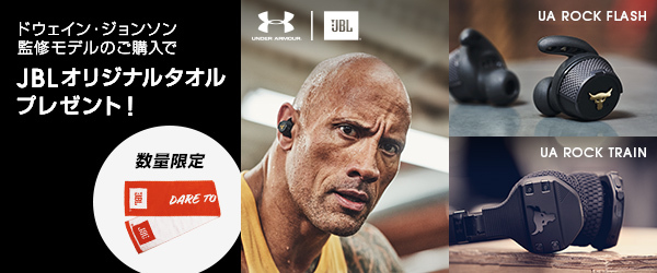 ハーマンインターナショナルは、JBLブランドから発売のドウェイン・ジョンソン監修完全ワイヤレスイヤホン「UA ROCK FLASH」、もしくはワイヤレスヘッドホン「UA ROCK TRAIN」をJBLオンラインストアで購入すると、JBLオリジナルタオルをプレゼントするキャンペーンを本日3月11日より開始する。