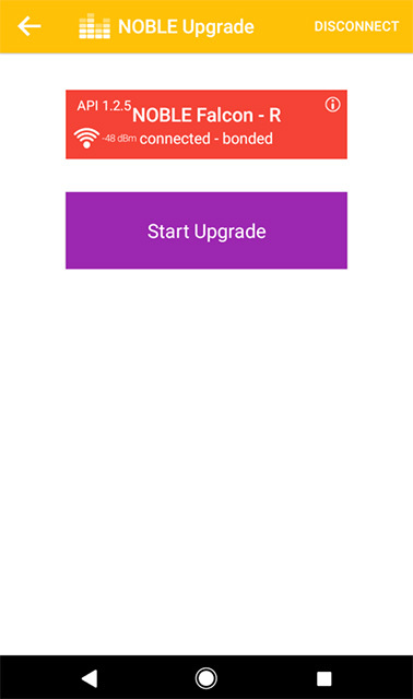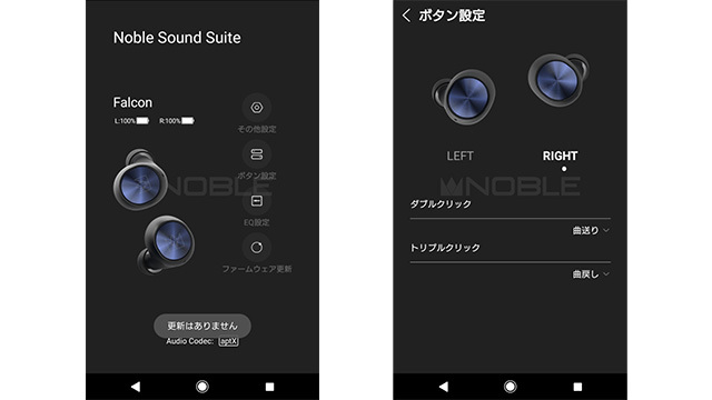 「Noble Update」は、FALCONのファームウェアをVer. 1からVer. 2に更新するためのアプリ。ファームウェアをVer. 2に更新することで、後述するコントローラーアプリ「Noble Sound Suite」が利用可能になるほか、ボイスプロンプト音量の調整(-6dB)、音楽再生中のLED点滅を停止といったユーザーからのフィードバックを反映した仕様変更が行われる。