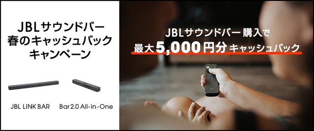 JBLは、期間中に対象のサウンドバーを購入して応募すると最大5,000円分をキャッシュバックする「JBLサウンドバー 春のキャッシュバックキャンペーン」を、本日3月13日から5月10日にかけて開催する。