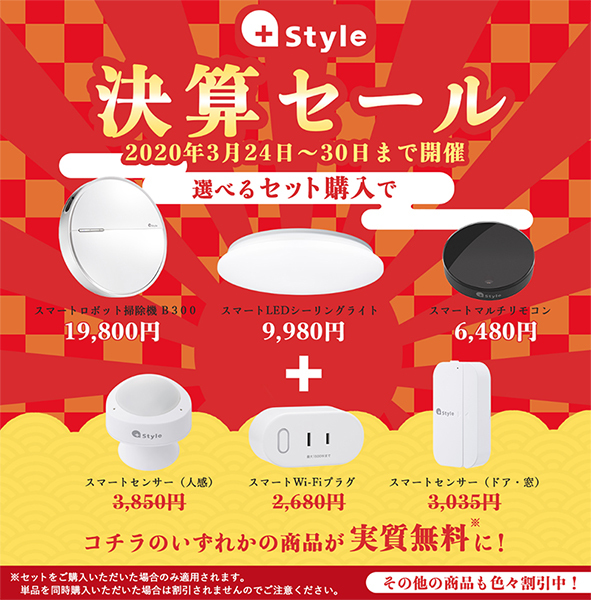 +Style、最大59%OFFの「決算セール」。ロボット掃除機など購入でスマートセンサー実質無料に