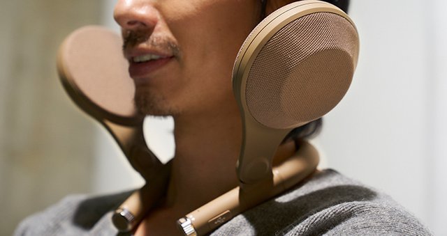 スピーカー位置は調整可能。また、装着が容易なようにネックバンド部分はエラストマー素材で柔軟性を持たせている。質量は約340g。首にかけて体で支える形状のため、「長時間ヘッドホンを使った時に起こる頭や耳の痛みや蒸れもなく、長時間使用でも快適に楽しむことが可能」だとアピールしている。