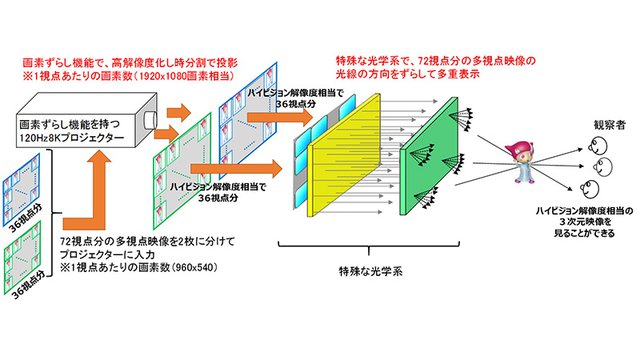 今回開発したシステムでは、72視点分の多視点映像を使用。さらに、画素ずらし機能を持つ8Kプロジェクターで、この多視点映像を高解像度化。そして、特殊な光学系を用いて、高解像度化された72視点分の多視点映像の光線の方向をずらして多重表示することで、これまでNHKが開発してきた約30万画素の3次元映像表示システムからフルHD解像度相当へと、大幅な高精細化を実現した。