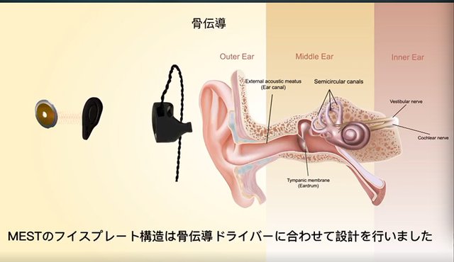 骨伝導ドライバーはフェイスプレート側に配置し、ハウジング全体を震わせて音を届ける仕組み。主に中域から中高域にかけて特性を発揮するとしている。開発時には17種類もの骨伝導ドライバーを試し、中でも高域ノイズや歪みの少ないものを採用したとのこと。