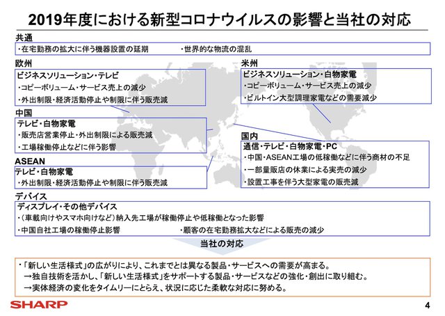 2019年度の新型コロナウィルスの影響と対応については、全社共通として、在宅勤務拡大に伴う機器設置の延期や世界的な物流混乱があった。商品事業では、国内では中国やASEANの工場の稼働低下で商材の確保ができなかったこと、3月後半の一部量販店の営業停止などにより、通信や白物家電、テレビ、パソコン事業などで齟齬が生じた。