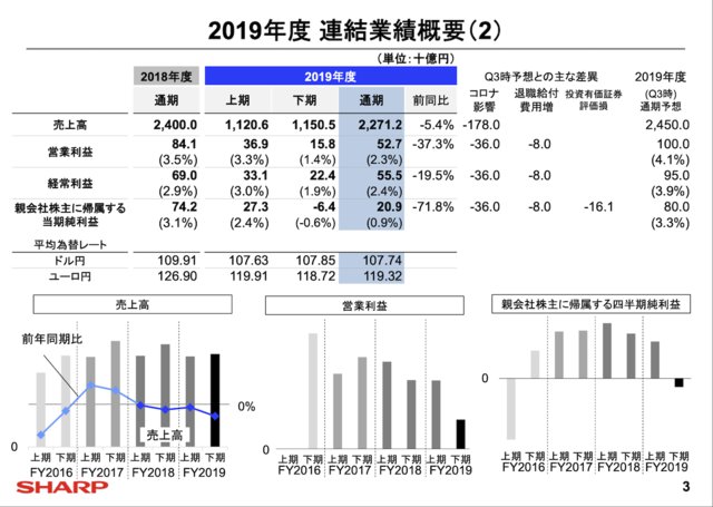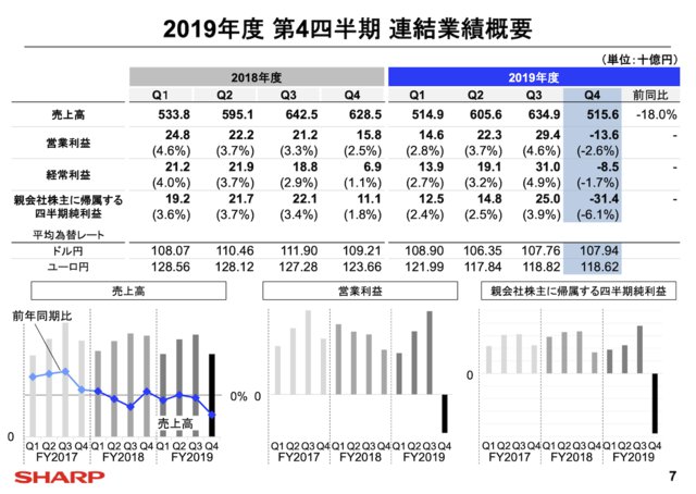 シャープは本日、2019年度決算説明会をテレフォンカンファレンスにて開催、同社代表取締役 兼 副社長執行役員 野村勝明氏が説明を行った。なお本日、現代表取締役・会長兼社長執行役員の戴正呉氏が代表取締役・会長執行役員 兼 CEOに、また野村勝明氏が代表取締役・社長執行役員 兼 COOに就任予定であり、本年度の定時株主総会とその後の取締役会にで正式決定される予定であることがアナウンスされた。