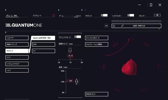 シリーズの最上位機種となるQuantum ONEには、より立体的なサウンドを実現する「QuantumSPHERE 360」を採用。これは同梱のキャリブレーションマイクでキャリブレーションプロセスとリセンタリングを行い、JBL独自のアルゴリズムによるヘッドトラッキング機能を使うことで、ゲーム内のサウンドの配置の精度を向上させるというもの。より高いレベルのサウンドクオリティと没入感を味わえるだけでなく、ゲーム内のオーディオポジショニングの精度を向上し、敵の場所や動きをより正確に察知できるとアピールする。