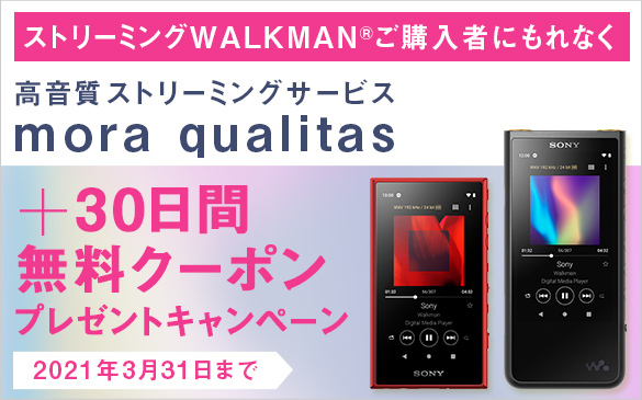 ソニーは、ストリーミングウォークマン「NW-ZX500シリーズ」「NW-A100シリーズ」の購入で、ハイレゾストリーミングサービス「mora qualitas」を30日間無料で利用できるキャンペーンを5月28日から開始する。応募期間は5月28日から2021年3月31日23:59まで。