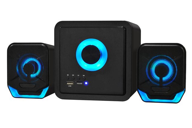 ブルーLEDによるイルミネーションを採用するほか、FMチューナーも搭載。本体サイズは、サブウーファーが130W×135H×130Dmmで、左右のスピーカーがそれぞれ80W×100H×77Dmm。ミニスピーカーで場所を取らないためPCモニターのそばに置くことができ、サブウーファーにより迫力のある低音を再生できるとする。