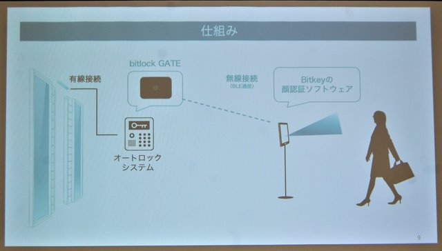今回、そのソリューションの第一弾としてエントランスのオートロックを顔認証で開錠するサービスを提供開始。こちらは「(1)エントランスに設置した認証装置となるタブレット端末が、顔を認識して顔の特徴量を抽出」、「(2)顔の特徴量と権利を保有したデジタルキーを集合玄関機内のbitlock GATEに送信」、「(3)bitlock GATEからの通信によりドアを開錠する」というもの。