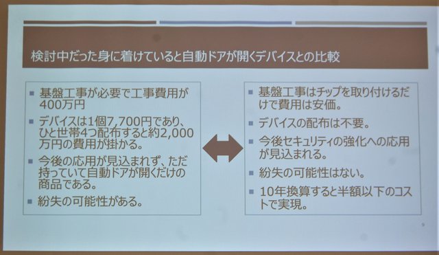 直前まで導入を予定していた“身につけていると自動でドアが開けられるデバイス”との比較では、「工事費用が安価で、また、約2,000万円もかかるデバイス代も不要になります。デバイスを紛失する心配も要りませんし、10年換算では半額以下のコストで実現できます」とメリットを説明した。クラウドによるビッグデータ管理やスマホ5G時代の広がり、AIによるデータ分析など「顔認証の導入により、マンションセキュリティの可能性が劇的に広がります。また、アフターコロナ時代に、顔認証での自動ドア開錠にとどまらず、エレベーター呼び出しやカード決済まで、“非接触”の選択肢も大幅に広がります」と訴えた。