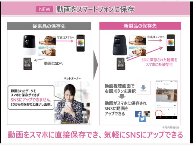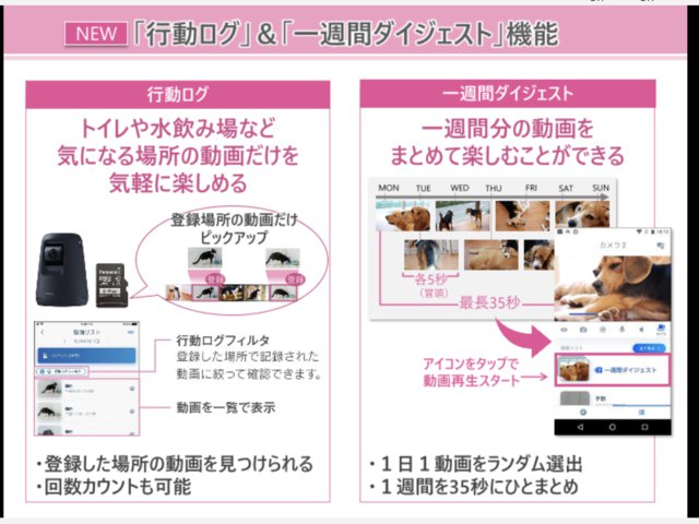 また新機能として、ペットにいたずらされてもカメラが倒れにくい「転倒防止構造」、トイレや水飲み場など登録した場所にペットが一定時間立ち寄った映像を簡単に確認できる「行動ログ」、1日1動画を自動でランダムに選んで先頭の5秒間をつないで再生する「一週間ダイジェスト」機能を搭載。さらに撮影された動画や写真の保存先は従来SDカードだったが、KX-HDN215ではスマートフォンに直接保存でき、SNSなどへのアップも便利になった。