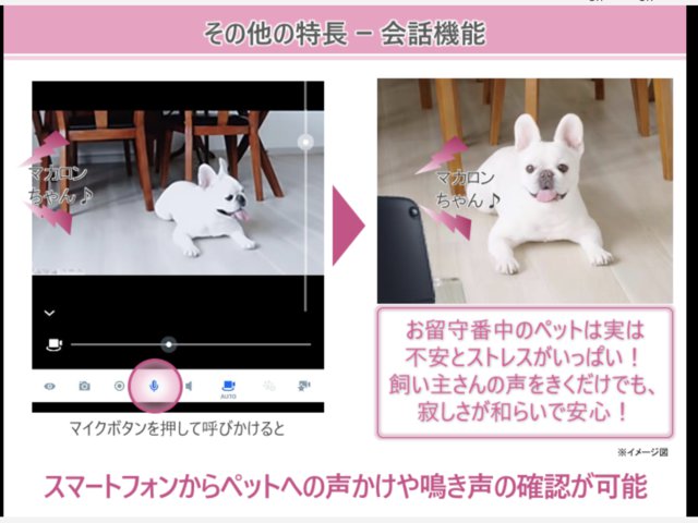 従来同様の機能では、ペットのいる室温の変化などを確認できる「温度センサー」や、スマートフォンを通じてペットに話しかけることができる「会話機能」、部屋が暗くなってもペットの様子を確認できる「ナイトモード機能」を備える。