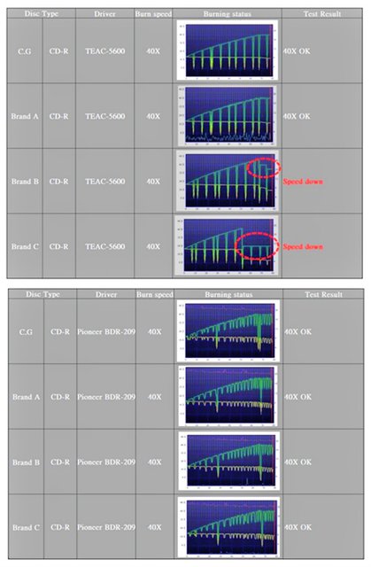 まず、記録測定では、安定したディスクの回転や適切に制御されたレーザーパワーなど、ドライブとの相性が見逃せない。テストでは、TEAC「5600」、Pioneer「BDR-209」の2種類のドライブを用いて40倍速で書き込みを行った。Pioneer「BDR-209」では、4種類のディスクともに問題は認められなかったが、TEAC「5600」では、「Brand B」「Brand C」において減速が認められた。