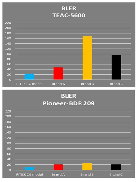 エラー率を比較してみると、TEAC「5600」、Pioneer「BDR-209」のいずれのドライブでも、エラー率が最も低くなったのが「Ritek Pro“CG”」。世界有数の光ディスクメーカーであるRitekの高度な生産技術や専用ラインを用いた徹底した生産管理、品質管理の成果が見事に結実している。再生時の音質を低下させる要因となる、デジタル信号の“タイミングの揺らぎ”を示すジッター値の比較でも、TEAC「5600」、Pioneer「BDR-209」ともに「Ritek Pro“CG”」が最も低い数値を示している。