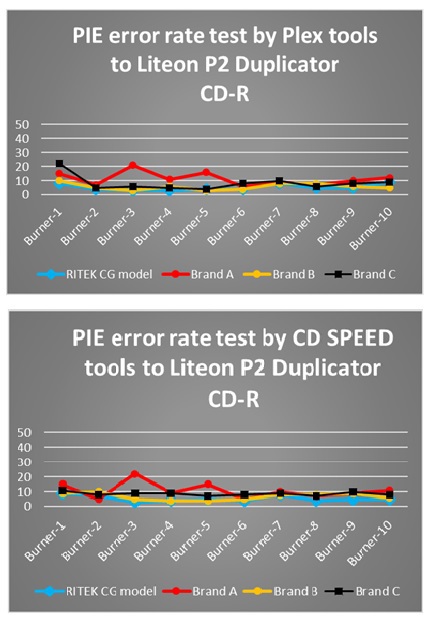 光ディスクへの記録品質を検査する「Plextool」と「CD SPEEDツール」という2つのツールを使用して、Liteonのデュプリケーター「Premium2」で書き込んだ際のそれぞれのエラーレートを比較した結果が次の通り。ここでも、4つの中では「Ritek Pro“CG”」がもっとも安定している。
