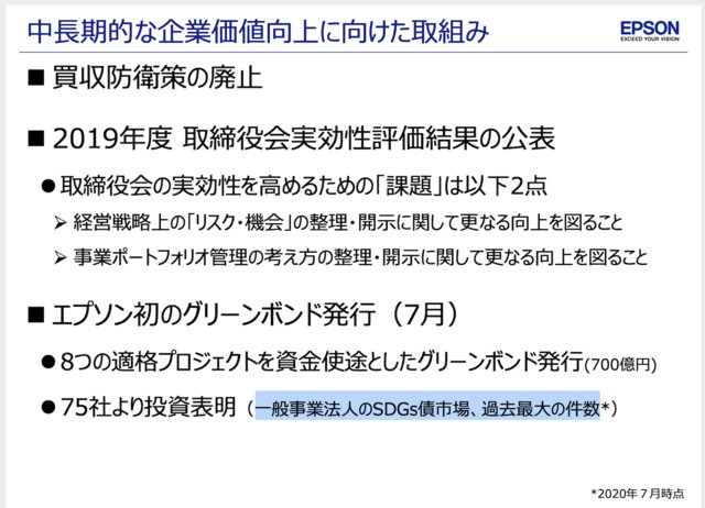 中長期的な企業価値向上に向けては、「企業価値の向上こそ防衛策」として買収防衛策を廃止。さらに7月にエプソン初のグリーンボンド発行を実施し、75社より投資表明があり、一般事業法人のSDGs債市場、過去最大の件数とした。