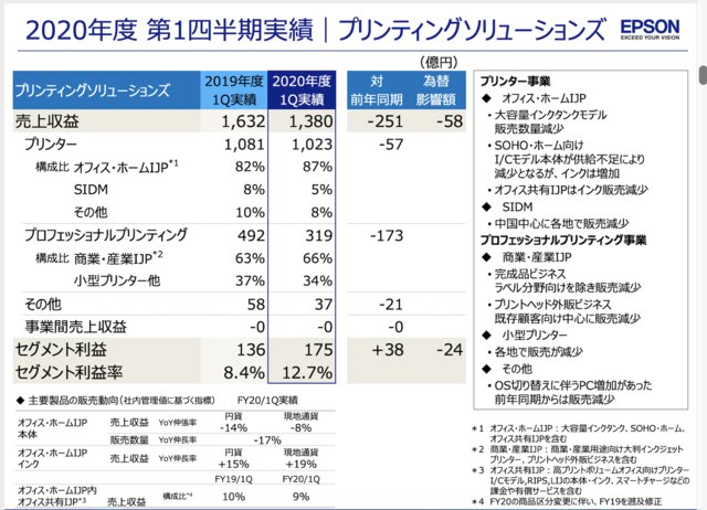 新型コロナウィルスの影響は1Qで拡大、各地で経済活動停滞、大部分の事業や商品で需要が大きく落ち込んだ。生産への制約も発生し、供給が滞る局面も発生。一方では、SOHO ホーム向けプリンターなどで在宅需要が継続拡大、インクの売上収益は前年度から大きく増加した。売上収益合計では530億円程度の大きなマイナス影響を受けた。