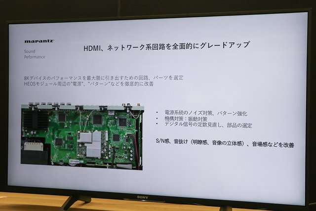 音質周りも全面的なブラッシュアップが行われているが、マランツのサウンドマネージャーを務める尾形好宣氏は「特に注力したのはHDMI/ネットワークオーディオ系回路のグレードアップ」だと説明する。
