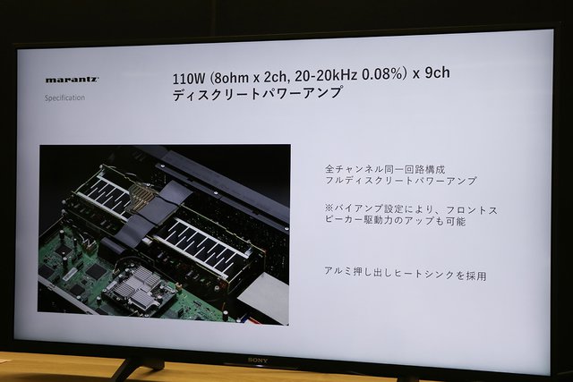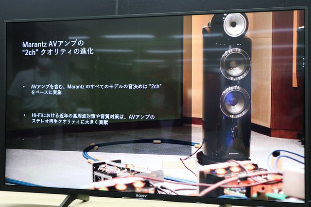 マランツのサウンドマネージャーを務める尾形好宣氏によれば、マランツではAVアンプを含む全製品において、2chでのステレオ再生をベースに音決めを実施しているのだという。本機を含むAVアンプも例外ではなく、またHi-Fiオーディオで培った高周波対策や音質対策のノウハウが活用されていることもあり、「AVアンプながらステレオでのオーディオ再生においてもピュアなマランツサウンドを楽しめる」としている。