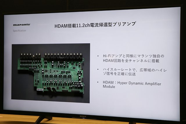 プリアンプはHi-Fiアンプと同様に、独自モジュールHDAM(High Dynamic Amplifier Module)を全チャンネルに搭載する11.2ch電流帰還型プリアンプを搭載。入出力セレクターやボリュームなど、それぞれの機能に特化したカスタムデバイスを用いて信号経路を最短化したことにより、透明感が高く情報量の豊かなサウンドを実現するという。