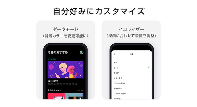 UIに「ダークモード」を追加。イコライザー機能も新たに加わり、「ビート」「リラックス」「コンサート会場」など8つのプリセットから、楽曲に合わせて好みの音質のものを選ぶことができるようになった。