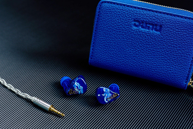 2pinプラグによるケーブル着脱に対応。付属ケーブルは銀メッキ高純度OFC導体と3.5mmステレオミニプラグを採用する。その他、青色のオリジナルイヤーピース、レザー調キャリングケースが付属する。