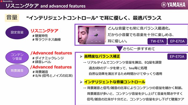 EP-E70Aが搭載する「リスニングケア(アドバンスド)」は、こちらを進化させたものとなる。音量だけでなく、再生しているコンテンツの録音レベルにあわせてリアルタイムで音量を算出し、バランス調整を行う。