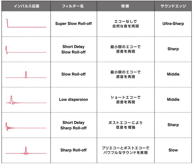 今回のアップデートにより、DACフィルターの選択オプションが追加。「Super Slow Roll-off」「Short Delay Slow Roll-off」「Slow Roll-off」「Low dispersion」「Short Delay Sharp Roll-off」「Sharp Roll-off」の6種類のDACフィルターを選択可能となる。なお本フィルターはPCM 192kHz/24bitまでの適用となり、DSD/MQAフォーマットには適用されない。