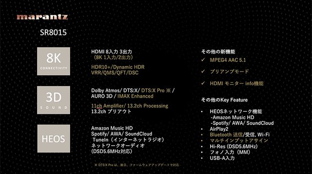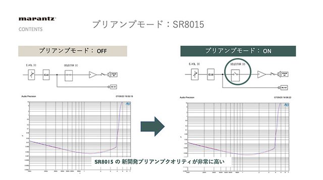 また、既に発表済みの「SR6015」等にも搭載されている「プリアンプモード」も搭載。内蔵パワーアンプを使わない際はオフにすることで相互干渉を排し歪みを改善するというものだが、SR8015は元々のプリアンプ性能が高いため、プリアンプモード時もほぼ特性が変わらないとのことだ。