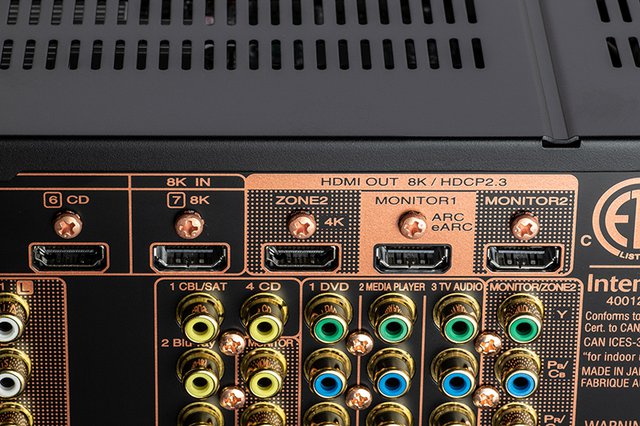 HDMI端子は入力8系統、出力3系統を用意。うち入力1系統と出力2系統が8K/60pおよび4K/120p映像信号のパススルーに対応するほか、全ての端子が著作権保護技術「HDCP 2.3」に対応。8Kアップスケーリング出力や、本機がスタンバイ状態でも入力信号を出力するHDMIスタンバイスルーにも対応する。