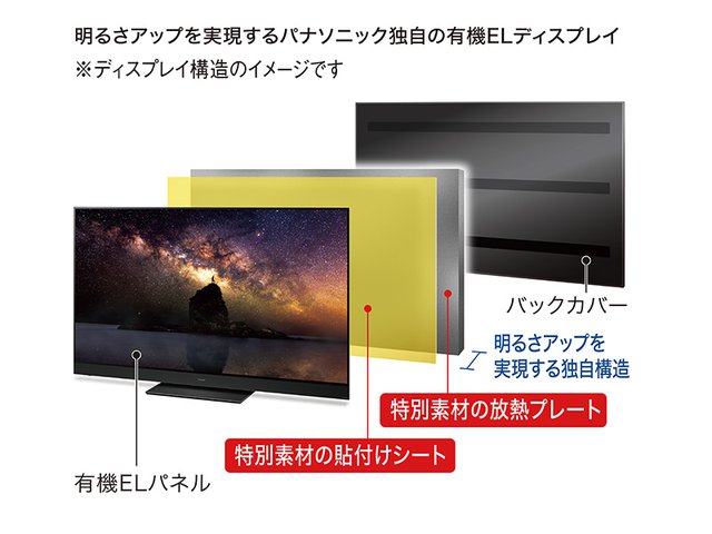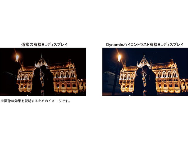 Dynamicハイコントラスト有機ELディスプレイは、「漆黒から眩い光の輝きまでをリニアに再現する」という理想のもと、かつてのプラズマディスプレイで培った技術を研鑽し、同社独自に設計、自社の工場で高精度に組み立てたもの。特別素材の放熱プレートと貼付けシートなどを独自の構造で構成することで一般的な有機ELディスプレイよりも放熱性能を高めている。これにより、有機ELパネルの発光性能を最大限に引き出し、高輝度化と 安定した発光を可能にすることで、より豊かなコントラスト表現を実現したという。
