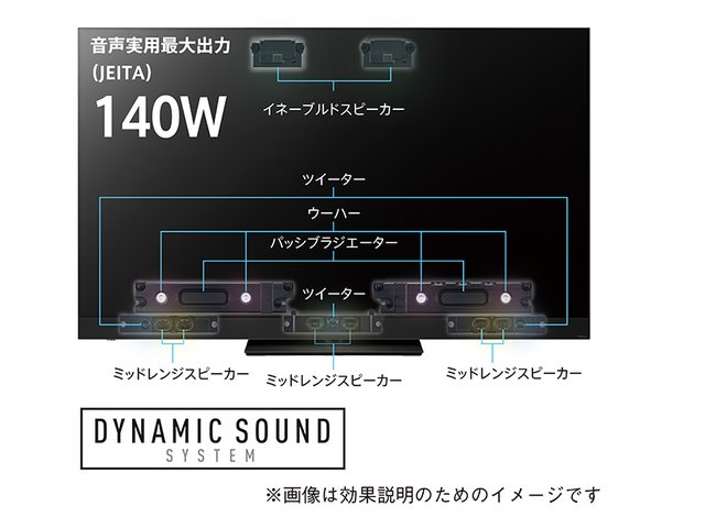 なお、イネーブルドスピーカーのほかに、テレビ正面にはトゥイーターと2つのミッドレンジスピーカーで構成される前向きスピーカーをセンターと左右に配置。さらに、2つのウーファーと対向配置のパッシブラジエーターで構成されるウーファーユニットを左右に配置。3ウェイ3.2ch+2chの音声実用最大出力140Wのシステム構成を採用している。