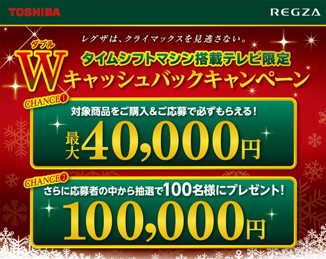 東芝映像ソリューションは、対象商品の購入者全員に最大4万円をキャッシュバックした上で、さらに抽選で100名に10万円をキャッシュバックする「タイムシフトマシン搭載テレビ限定 Wキャッシュバックキャンペーン」を10月30日より開始する。