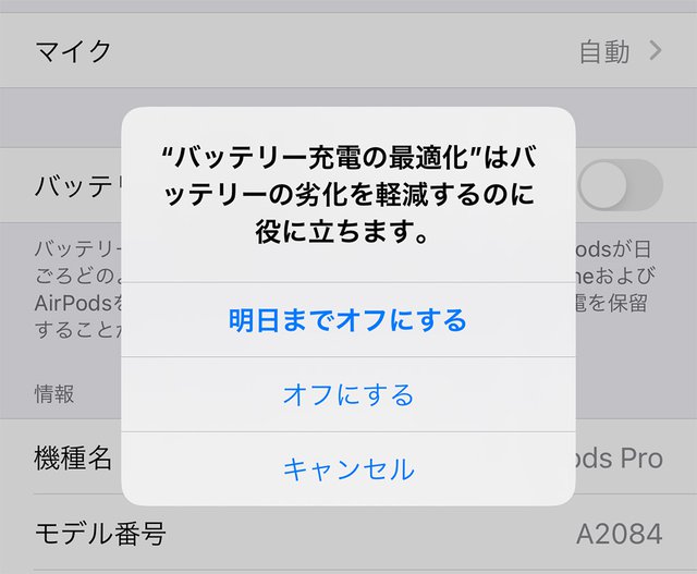 実際にOSをアップデートし、AirPodsをデバイスへ近づけてみると、いつものようにバッテリー残量が表示される。そこに、記者の場合は「バッテリー充電の最適化 AirPodsは15時までに充電を完了するようにスケジュールされています」という文言が表示された。