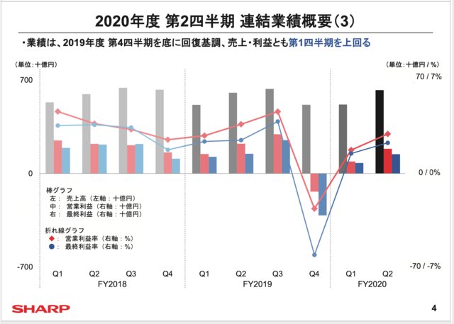 シャープ(株)は本日、2020年度2Q決算説明会を開催した。2020年度2Qの連結業績は表のとおり。