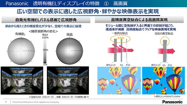 また、ディスプレイモジュール内の各部材を、真空で高精度に貼り合わせることで反射ロスを抑え、透明性を高めた。これにより、高い透明性と色鮮やかな高画質映像を実現するとしている。「例えば、スマートフォンの保護フィルムを貼るのにも気泡が入らないようにするのに気を使う。今回はそれを55型というサイズで高精度に行っている」(商品企画部 村山靖部長)とアピールした。