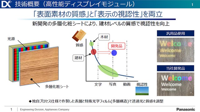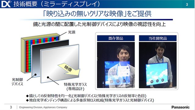そして、今回の発表にあわせて開催したオンライン説明会では、前述のように “次世代ディスプレイ” についても紹介。新開発の多層化粧シートを用いた「高性能ディスプレイモジュール」と、映り込みの無いクリアな映像を実現したという「ミラーディスプレイ」について説明した。