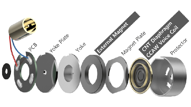 ドライバーユニットは10mmのダイナミック型を1基搭載。カーボンナノチューブ(CNT)振動板、CCAWボイスコイル、強い磁力を生み出す外磁型回路などを組み込んでいる。