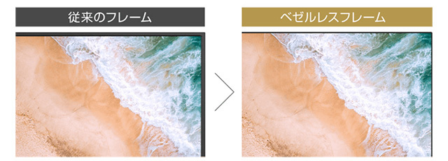 フチの狭いベゼルレスフレームにより表示面積を可能な限り広げ、ブルーレイ等の4K映像、リアルで立体感のあるHDR映像をより大きな迫力をもって楽しめるとする。HDR方式はHDR10をサポートする。