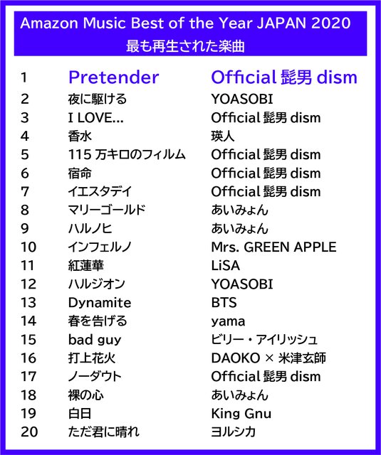 ストリーミング、CD販売、MP3ダウンロードを総合的に合算した、「最も人気のあったアーティスト」もOfficial髭男dismに決定。また、Amazon Musicで2020年最もストリーミング再生された楽曲は、Official髭男dismの「Pretender」がトップに輝いた。Official髭男dismは、トップ20中6曲がランクインし、「2020年の勢いが感じられる結果となった」と紹介している。また、YOASOBIや瑛人、yamaなど、ソーシャルメディアでの話題をきっかけにブレイクしたアーティストの楽曲も多くランクインした。